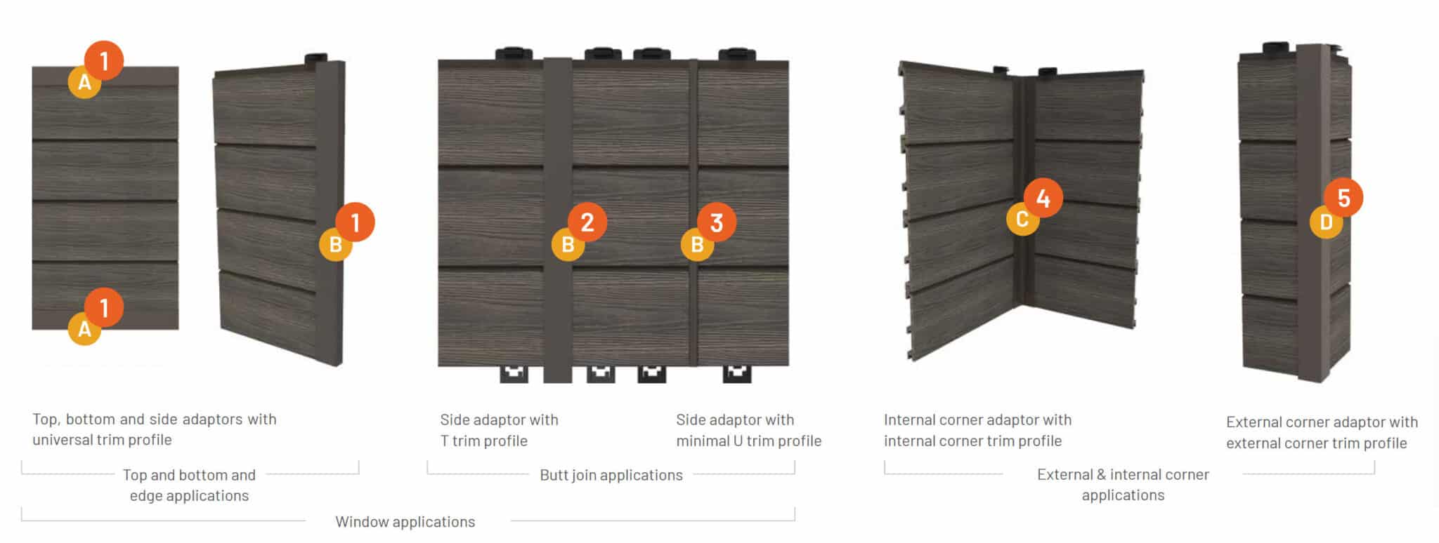 Trim accessories hide the structure for a neat final look and can be installed using sealing strips to improve the weather resistance of the cladding surface. The clip strip allows for easy guided placement of the adaptors and the universal trims may be used with VistaClad or any cladding boards with a thickness of 20.5 mm to 26.5 mm.